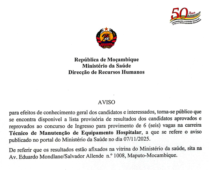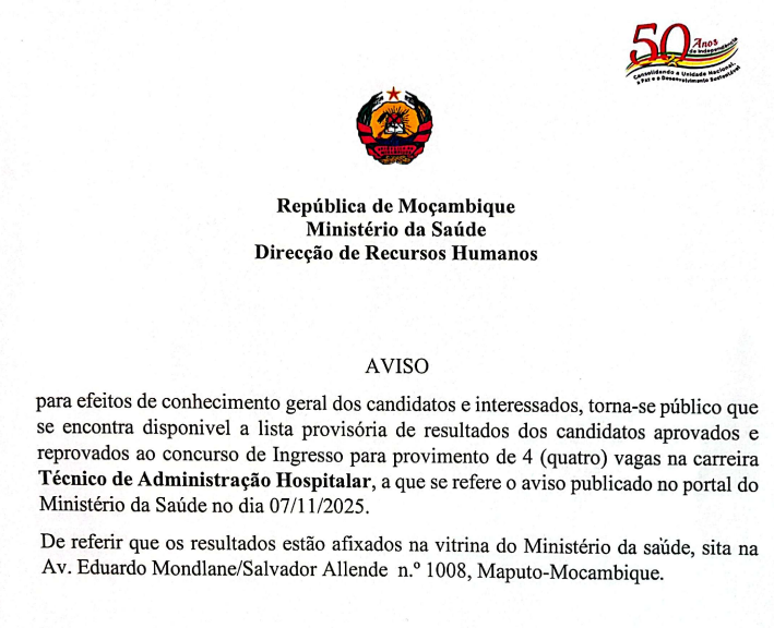 De referir que os resultados estão afixados na vitrina do Ministério da saúde, sita na Av. Eduardo Mondlane/Salvador Allende n.° 1008, Maputo-Mocambique.